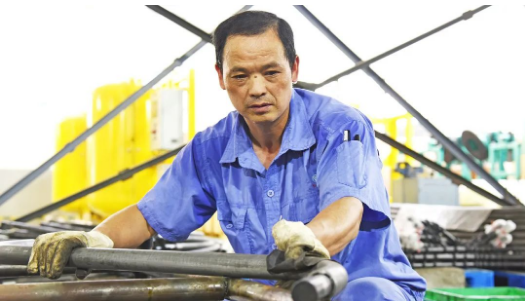 排壓管車間,程師傅在悶熱的環(huán)境中打磨排壓管護套管。