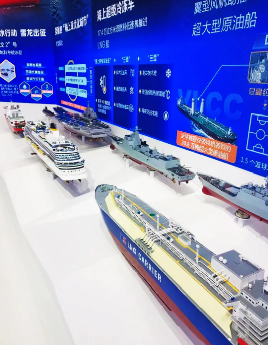 進(jìn)入中國(guó)船舶展廳,觀眾不僅能夠看到“奮斗者”號(hào)全海深載人潛水器、“雪龍2”號(hào)極地科考船等多個(gè)高科技品牌產(chǎn)品,還可以通過(guò)航空母艦、常規(guī)動(dòng)力潛艇、驅(qū)逐艦、護(hù)衛(wèi)艦?zāi)P土私馕覈?guó)國(guó)防裝備實(shí)力。