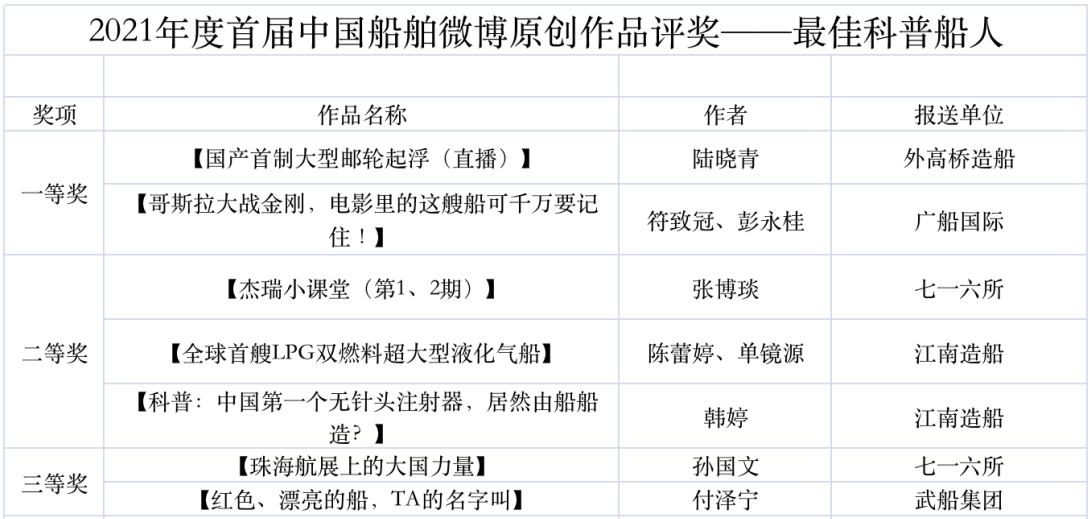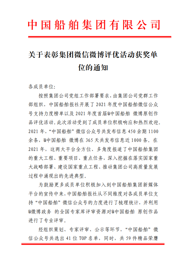 為鼓勵(lì)更多成員單位積極加入到中國船舶集團(tuán)新媒體平臺(tái)的宣傳中來,在集團(tuán)公司黨群工作部的指導(dǎo)下,中國船舶報(bào)社從不同維度,對(duì)2021年度各單位支持“中國船舶”微信的力度進(jìn)行了梳理統(tǒng)計(jì),并利用微博政務(wù)的全國專家?guī)煸u(píng)審資源,對(duì)2021年度“中國船舶”微博原創(chuàng)作品進(jìn)行了專業(yè)評(píng)審,評(píng)選結(jié)果公布如下: