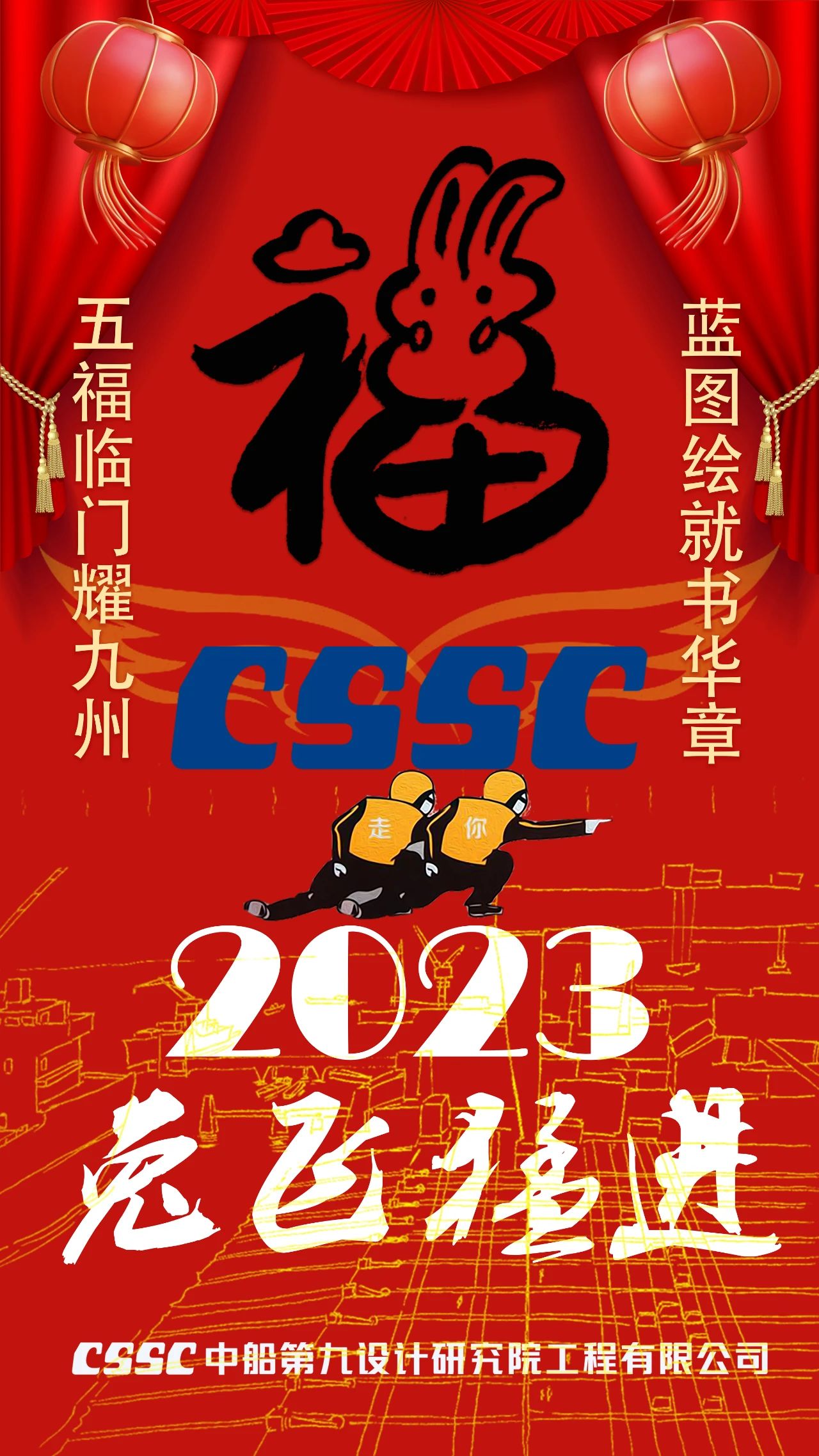 渤海造船的拜年海報以紅色背景為基礎,奠定喜慶祥和的節日氛圍,畫面主體采用中國傳統民間剪紙藝術,將飛騰的瑞兔與破浪的國之重器有機結合,讓我們2023年突飛猛進,大展宏圖!