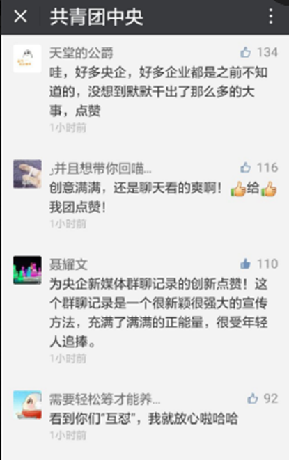 中國人民大學(xué)新聞學(xué)院教授宋建武認(rèn)為,“央企新媒體群聊記錄”的走紅,是因?yàn)檎鎸?shí)、接地氣、參與感強(qiáng),“每個人都有群聊的經(jīng)歷,這種方式使人們感覺親切、有趣”,公眾需要和喜聞樂見才是它能夠吸引人、感染人的原因。