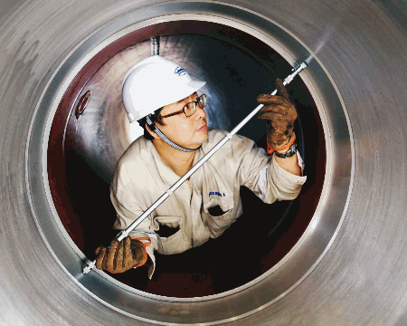 上海船院質量檢測工程師正在檢測扭曲舵套筒。該扭曲舵由上海船院研發設計,將用于黃埔文沖在建的2700TEU集裝箱船。