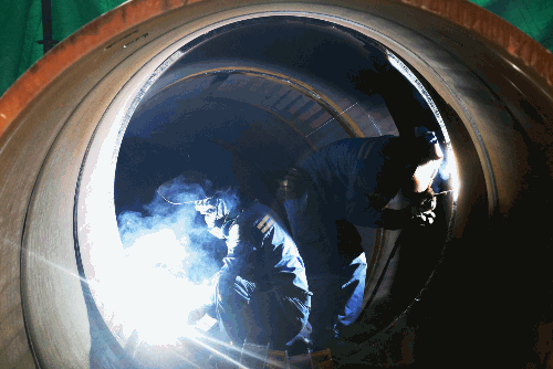 廣船國際首個吸力筒導管架風機基礎施工現場,技術工人正在進行管子焊接作業。