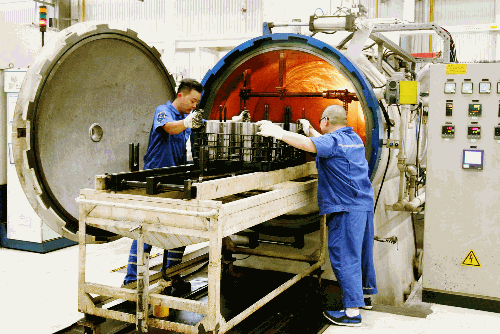 淬火的爐旁,氣溫高達50°C。重慶紅江操作師傅嫻熟地將工件從爐內拉出,吊裝到指定工位進入下道工序,再裝上另一批產品入爐,繼續進行熱處理。