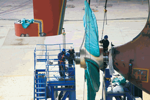 大船集團山船重工塢內施工現場,鉗工正在進行螺旋槳安裝工作,為后續該船按期出塢打下基礎。