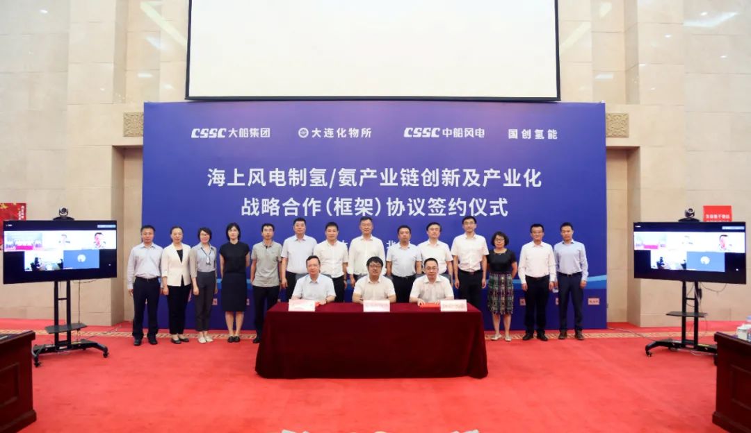 8月6日,中國(guó)船舶集團(tuán)旗下大船集團(tuán)舉行《海上風(fēng)電制氫/氨產(chǎn)業(yè)鏈創(chuàng)新及產(chǎn)業(yè)化戰(zhàn)略合作(框架)協(xié)議》簽約儀式。大船集團(tuán)與大連化物所、國(guó)創(chuàng)氫能、中船風(fēng)電四方代表在協(xié)議書(shū)上簽字。