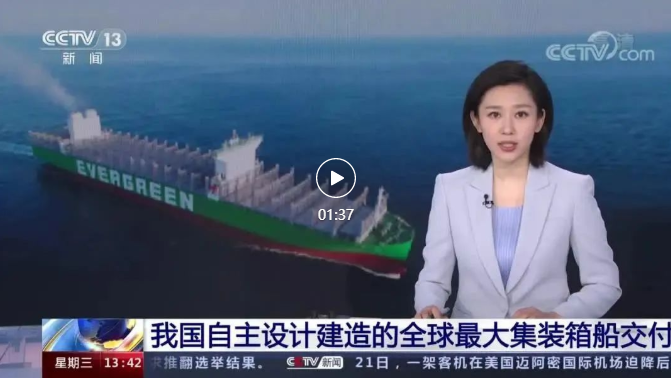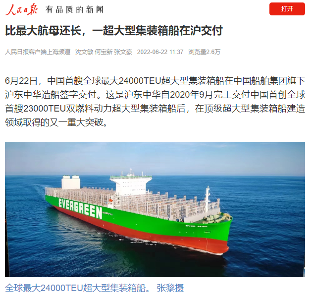 今天,中國(guó)首艘全球最大24000TEU超大型集裝箱船在中國(guó)船舶集團(tuán)旗下滬東中華簽字交付,比最大航母還長(zhǎng),甲板面積相當(dāng)于3.5個(gè)標(biāo)準(zhǔn)足球場(chǎng),最大堆箱層數(shù)可達(dá)25層,相當(dāng)于22樓的高度……