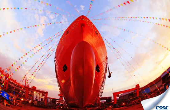 黃埔文沖建造的1400TEU雙燃料集裝箱船即將下水,美麗的船船與嫻麗多彩的天空融為一體,展現出一幅展翅欲飛場景。