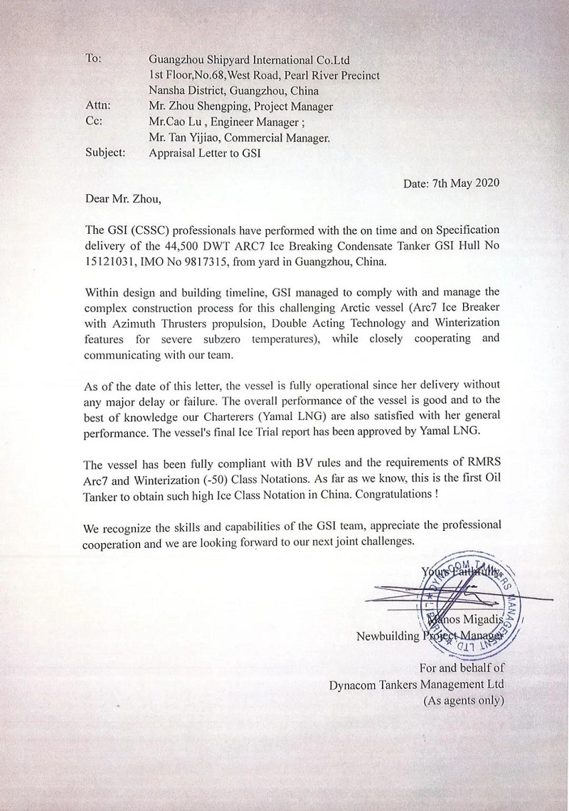 ????5月7日,中國(guó)船舶集團(tuán)旗下廣船國(guó)際收到了來(lái)自希臘Dynacom航運(yùn)公司的感謝信,信中贊揚(yáng)了廣船國(guó)際為其建造的極地凝析油船“BORIS SOKOLOV(鮑里斯索科洛夫)”號(hào)