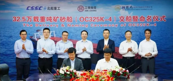 武船集團北船重工為工銀租賃和招商輪船建造的32.5萬噸礦砂船4號船“ORE CHONGQING”號命名暨交船儀式在3號碼頭舉行。