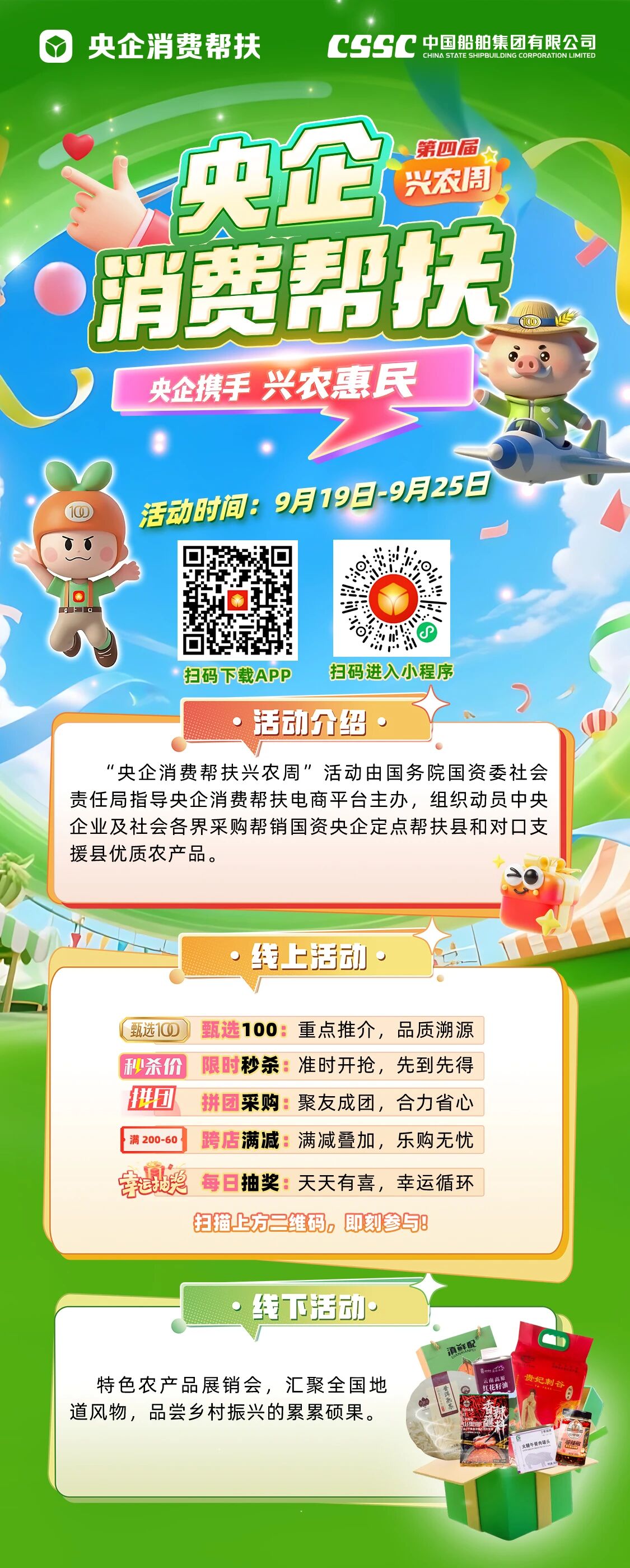 9月19日,以“央企攜手,興農(nóng)惠民”為主題的第四屆“央企消費幫扶興農(nóng)周”活動在北京正式啟動。中國船舶集團有限公司在同期舉行的特色農(nóng)產(chǎn)品展銷會上精心布置了特色展區(qū),現(xiàn)場展銷來自其定點幫扶的鶴慶、勐臘、丘北三縣的110款優(yōu)質特色農(nóng)產(chǎn)品。
